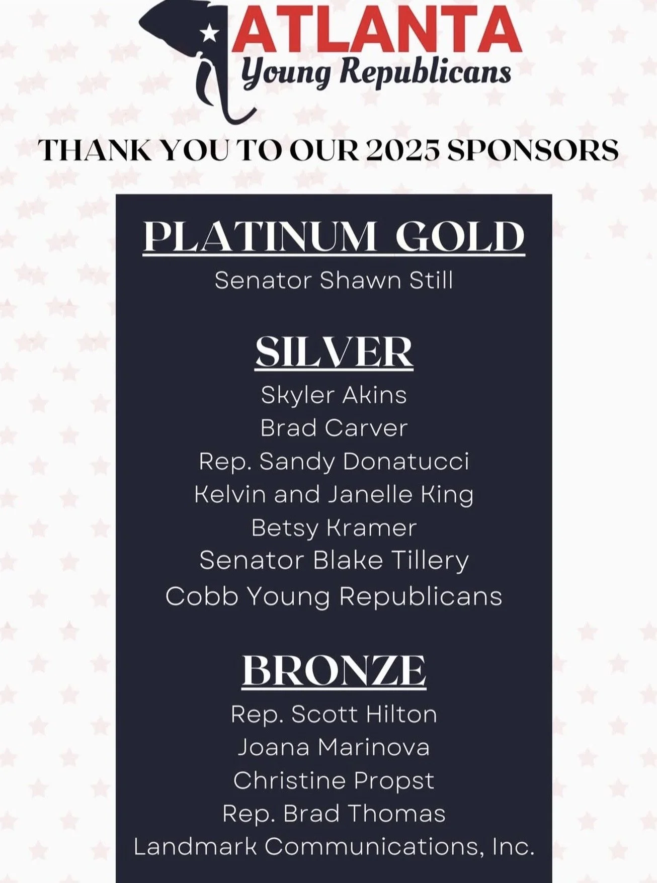 Becoming a Sponsor of the Atlanta Young Republicans is a great way to get involved with our club, whether you are a member or not. Thank you for believing that our club is worth investing in, and wanting to help us grow and achieve success.